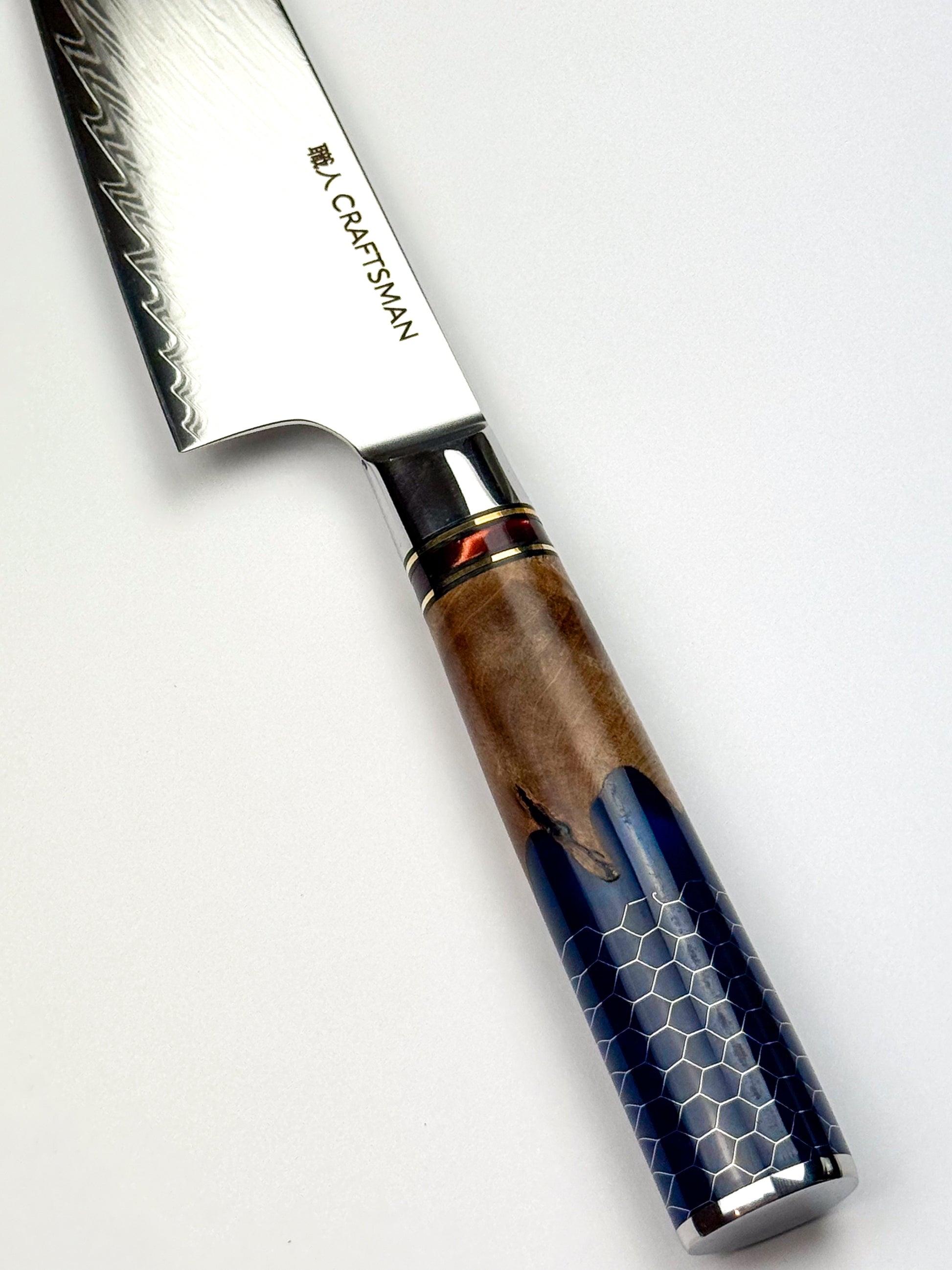 This 8-inch chef’s knife is forged from 67 layers of Damascus steel, delivering razor-sharp precision, strength, and durability. The handle combines natural wood, modern resin, and a unique honeycomb design, making each knife one-of-a-kind. Perfect for chopping, slicing, or dicing, it’s the all-purpose blade every kitchen deserves.